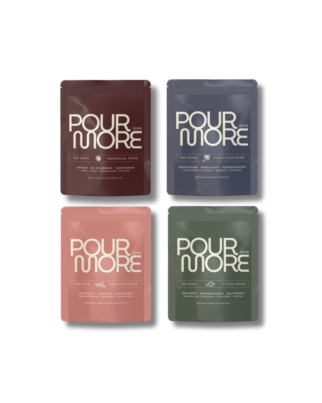 One blend all month misses the mark. Our four teas align with each phase - Menstrual (comfort & minerals), Follicular (gentle lift & clarity), Ovulation (balance & glow), Luteal (calm & digestive ease) - so your daily ritual fits how you actually feel.